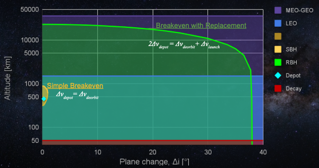Satellite deployments are on the increase (doubling approximately every 2 years), so the demand for more capability on orbit is growing. At the same time, satellite life has decreased from 20 to 5 years. It is pretty safe to assume constellation owners desire to provide continuity of service, and will be replacing sats on a regular schedule. Hence from both the overall economics and the constellation operator economics it makes more sense to include the replacement cost in terms of Δv. When this is done, the replacement breakeven must include a relaunch to replace any deorbited mass. This shifts the viability region out to the green line, where replacement breakeven (RB) depot favored region includes the planes up to 38 degrees in LEO . From the ISS orbital plane then, all polar orbits (+35 deg) are accessible. That does not preclude putting another depot in a polar orbit!